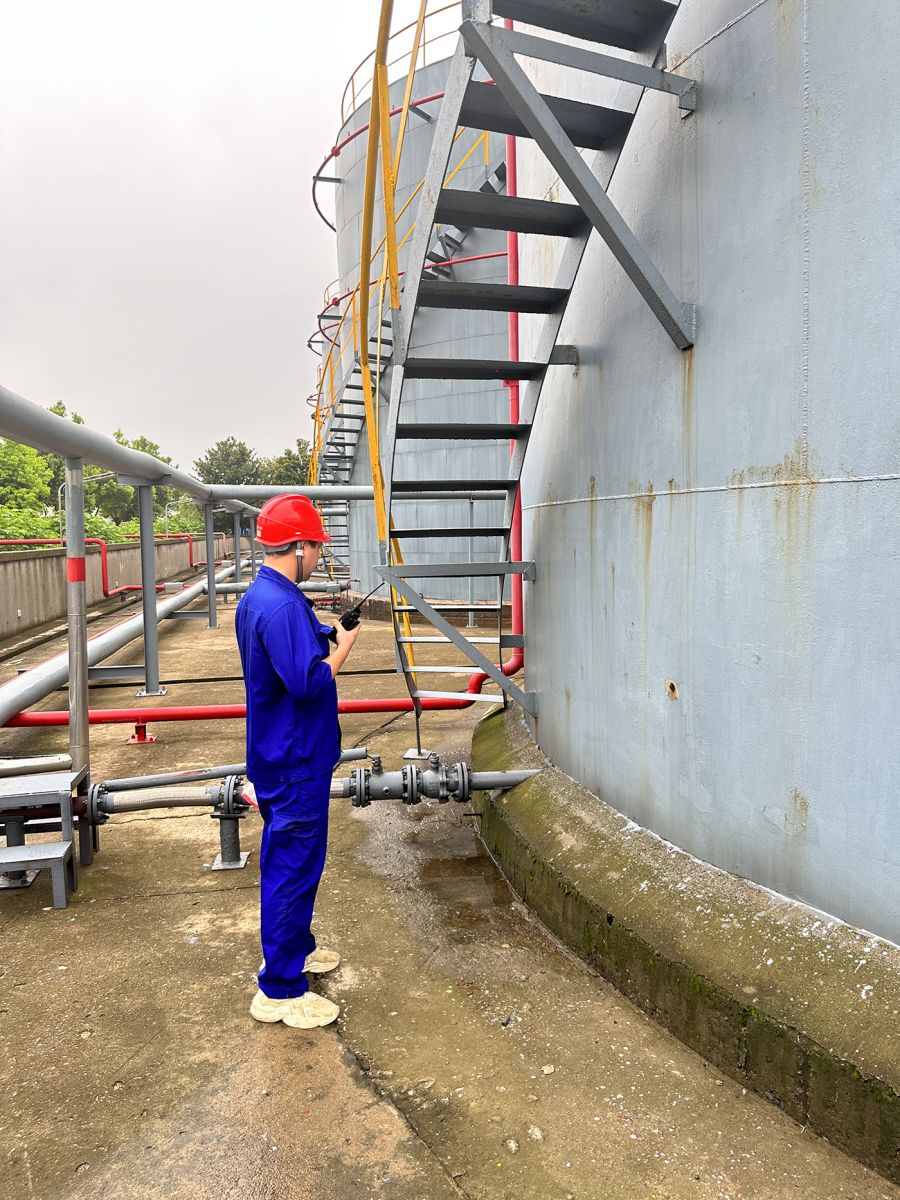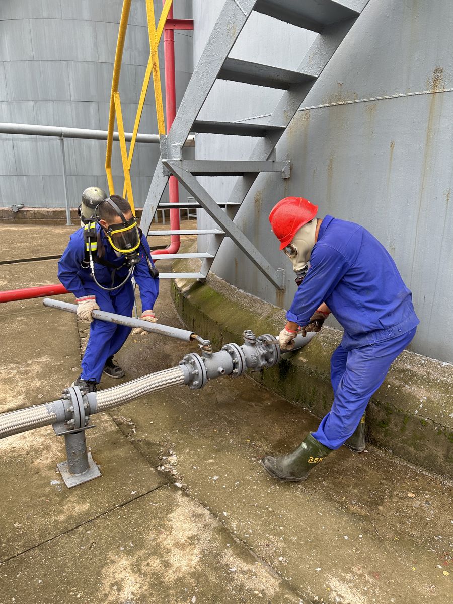本次演練活動預(yù)設(shè)為加氫車間現(xiàn)場操作人員蘭世杰在生產(chǎn)巡檢過程中發(fā)現(xiàn)鄰甲罐V-3141出口第一道閥門泄露鄰甲,經(jīng)查發(fā)現(xiàn)閥門墊片泄露嚴(yán)重,立即用對講機(jī)向當(dāng)班調(diào)度朱洪濤匯報(bào)險(xiǎn)情。“立即啟動應(yīng)急預(yù)案,必須將險(xiǎn)情控制在萌芽狀態(tài)!”隨著調(diào)度一聲令下,各參演人員迅速進(jìn)入演練狀態(tài),現(xiàn)場操作人員陳洪山、劉澤軍立即檢查并關(guān)閉所在儲罐區(qū)圍堰的出口閥門;肖世華、周多兵穿戴好空氣呼吸器趕赴泄露現(xiàn)場關(guān)閉第一道出口閥,更換泄露的閥門墊片,就近開啟室外消火栓對泄漏點(diǎn)實(shí)施噴淋稀釋物料;分析人員段堂娟進(jìn)行氣體及水體監(jiān)測分析,消除事故隱患。