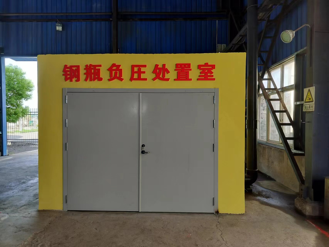 依據(jù)《2023年安全重點工作任務清單》提出的“在7月底前完成液氯鋼瓶充裝廠房設置液氯鋼瓶負壓密閉處置間及相對應的氯氣吸收裝置”的年度重點工作任務??少惞卷椖坎扛鶕?jù)相關標準規(guī)范并參考同行業(yè)的先進做法,編制了液氯充裝廠房鋼瓶負壓處置室的改造方案。改造方案經(jīng)公司審核通過后,項目部于2023年5月底啟動鋼瓶負壓處置室的改造工作,并于6月中旬完成了改造施工任務,6月26日通過公司內(nèi)部驗收并移交給使用單位。