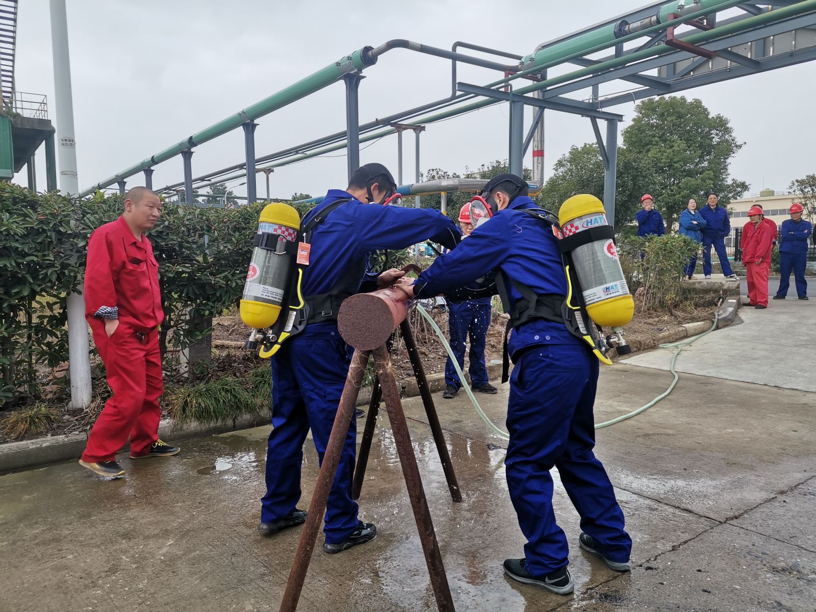 此次消防比武設(shè)有滅火、堵漏、水帶三項(xiàng),比賽5個(gè)代表隊(duì)分別為電解車間、動(dòng)力車間、氯車間、加氫車間、機(jī)關(guān)聯(lián)隊(duì)。賽制要求每個(gè)代表隊(duì)人數(shù)不低于八人,三項(xiàng)項(xiàng)目,每一項(xiàng)項(xiàng)目隨機(jī)抽取兩人合作比賽,不得重復(fù)參賽。這種賽制要求我們的參賽隊(duì)員要精通每一項(xiàng)比賽項(xiàng)目并且和其他七人都有充分的默契。