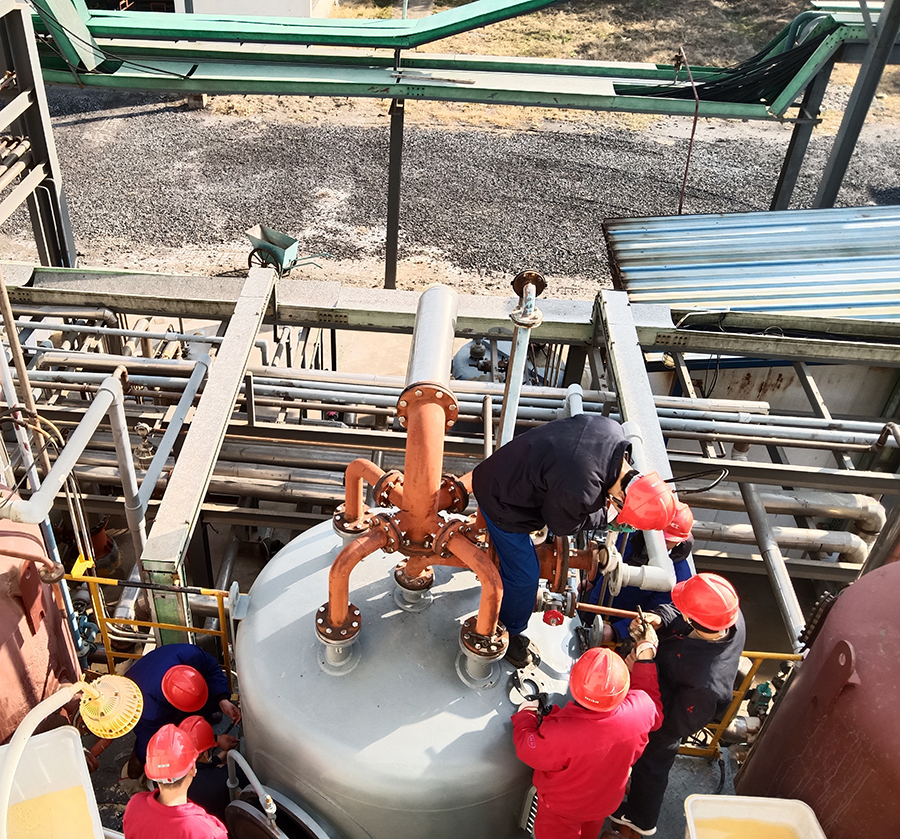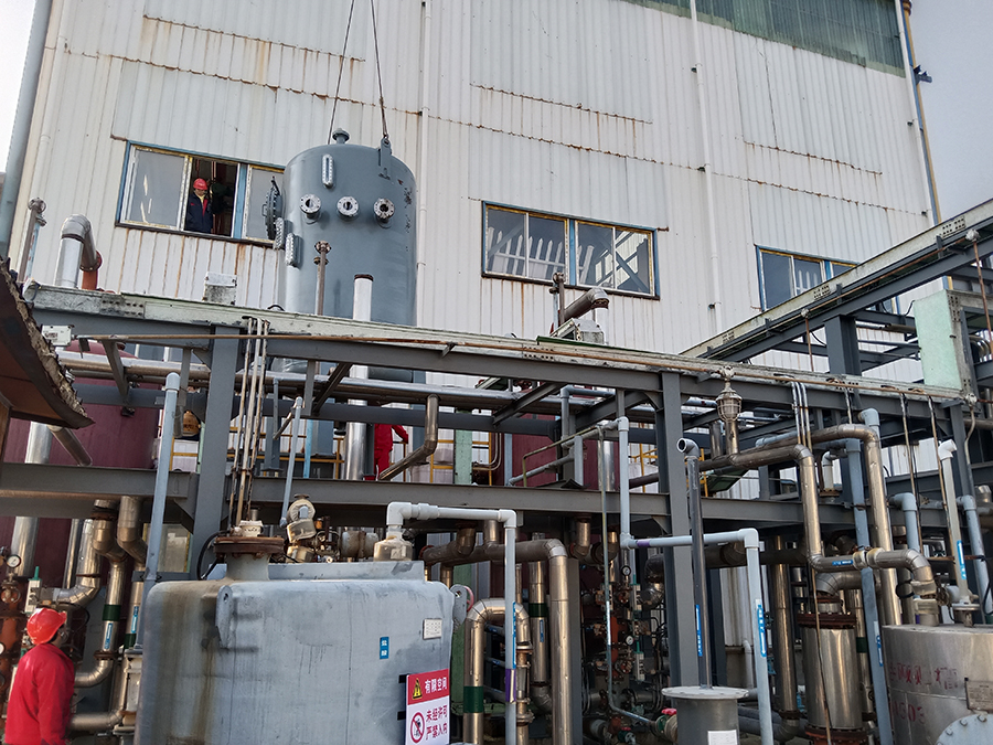 此次更換吊裝空間小、管線復(fù)雜、精準(zhǔn)度要求高,經(jīng)過大家的共同努力和精心操作,在一天半時間內(nèi)圓滿完成了鰲合樹脂塔更換任務(wù)。