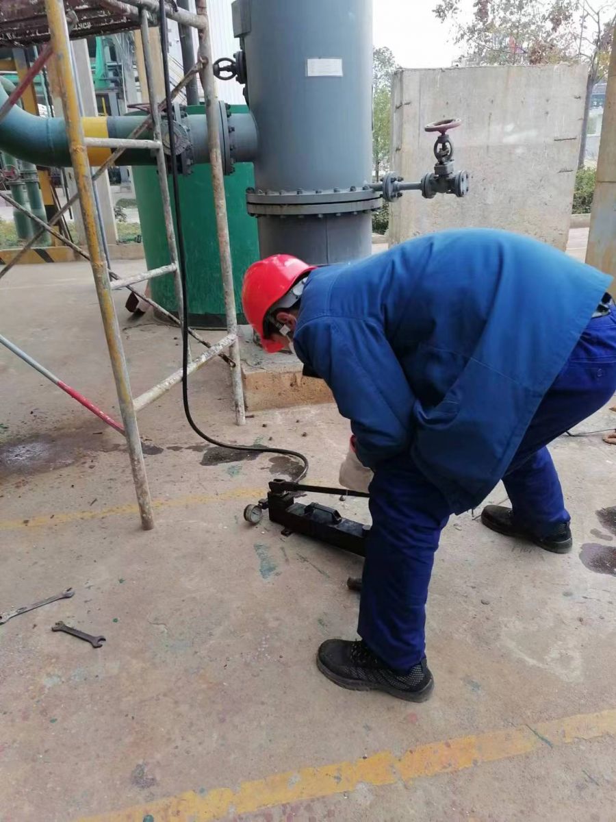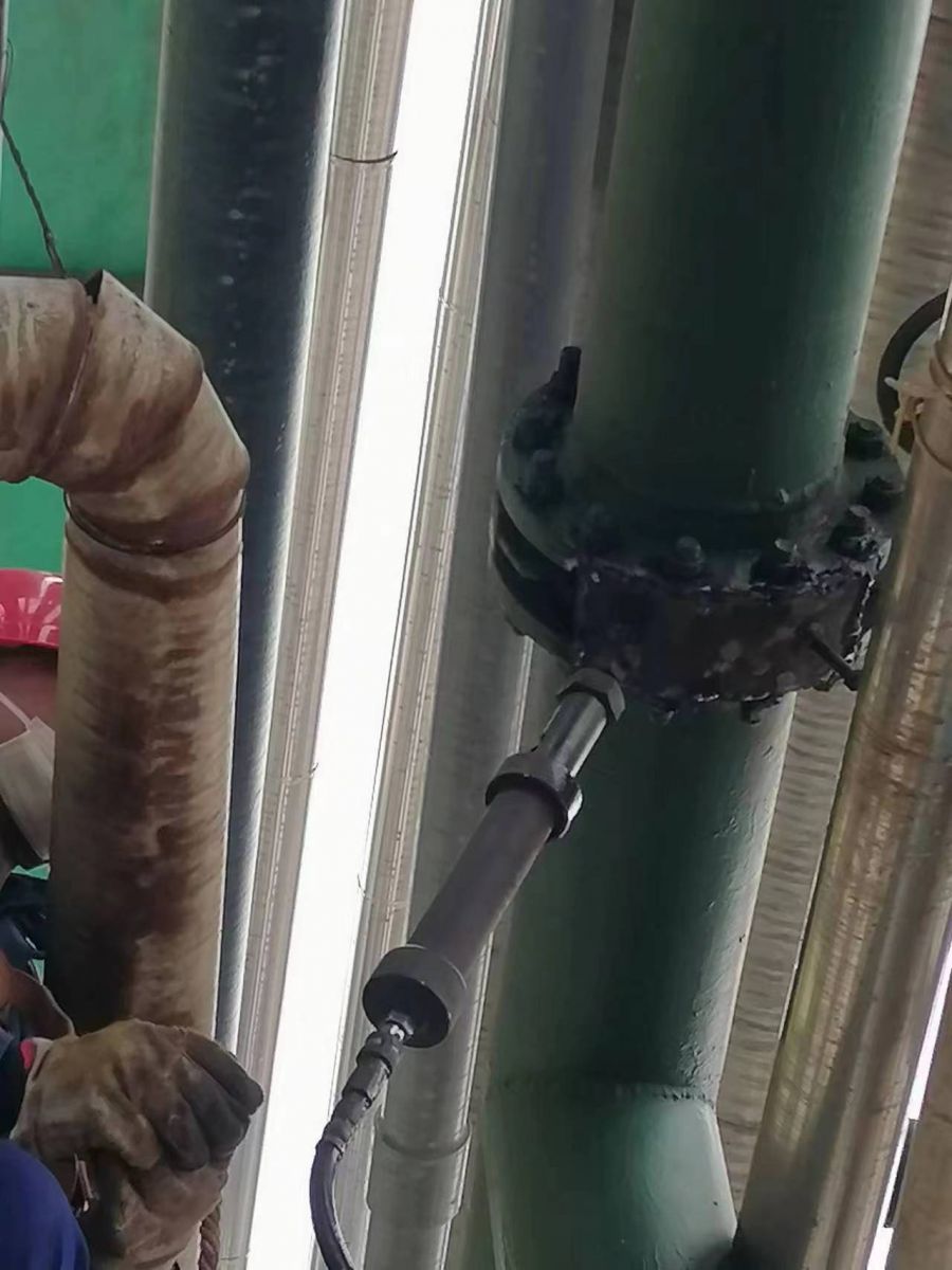 為了防止氯氣外溢污染環(huán)境,他對滲漏點(diǎn)的法蘭螺栓進(jìn)行了加固處理,但效果不明顯,正當(dāng)他萬分著急之時(shí),車間領(lǐng)導(dǎo)何國亮和李敬平已趕赴現(xiàn)場,經(jīng)他們進(jìn)一步檢查發(fā)現(xiàn),對夾閥門墊片已變形,僅加固螺栓已不能解決滲漏。為了不影響正常生產(chǎn),大家研討后決定用帶壓密封料對其進(jìn)行堵漏處理,經(jīng)過近兩小時(shí)的焊模安裝、加料打壓后,終于成功堵住了滲漏點(diǎn)。