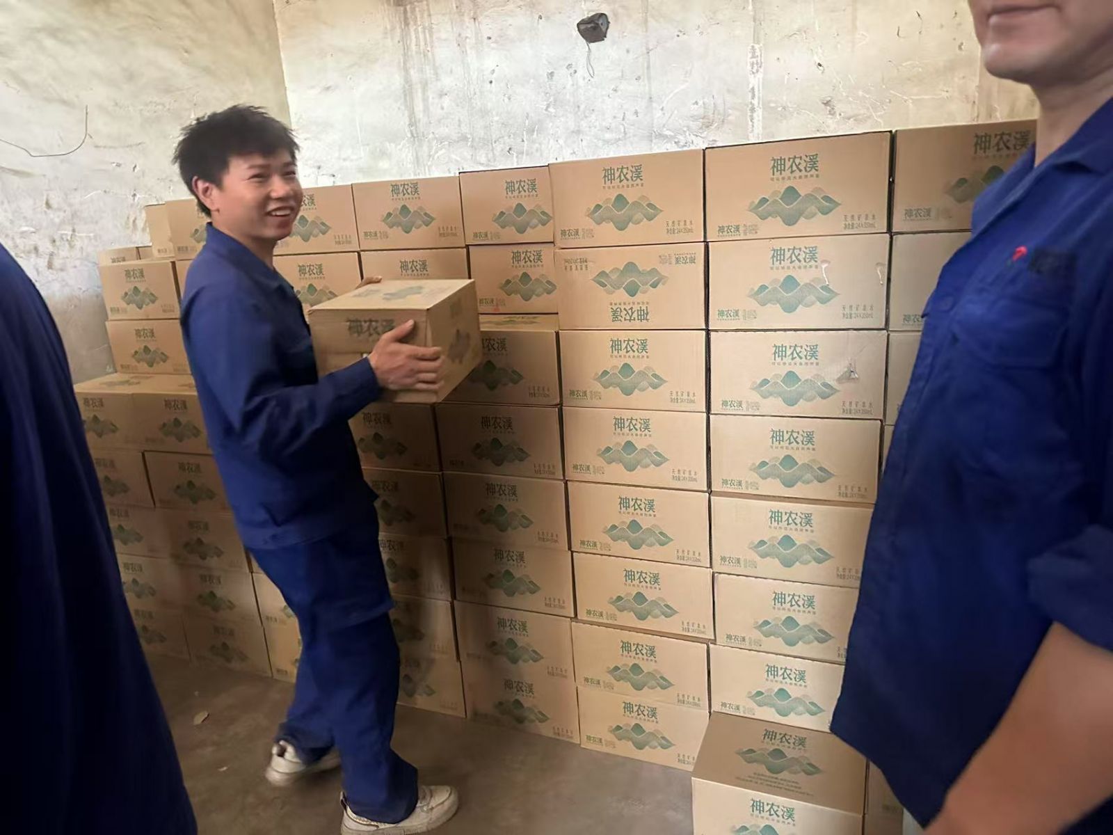 烈日當空,堆積如山的礦泉水箱在陽光下泛著耀眼的光。青年員工們主動請纓,幾名身手矯健的員工一個箭步躍上車廂,其他隊員迅速在車下排成兩條人形傳送帶。“注意接力!”“左邊再來一箱!”的呼喊聲此起彼伏。更令人動容的是,幾位部門負責人身先士卒,或彎腰推車,或肩扛貨箱,汗水很快浸透了他們的藍制服,在背后洇出深深淺淺的鹽漬。