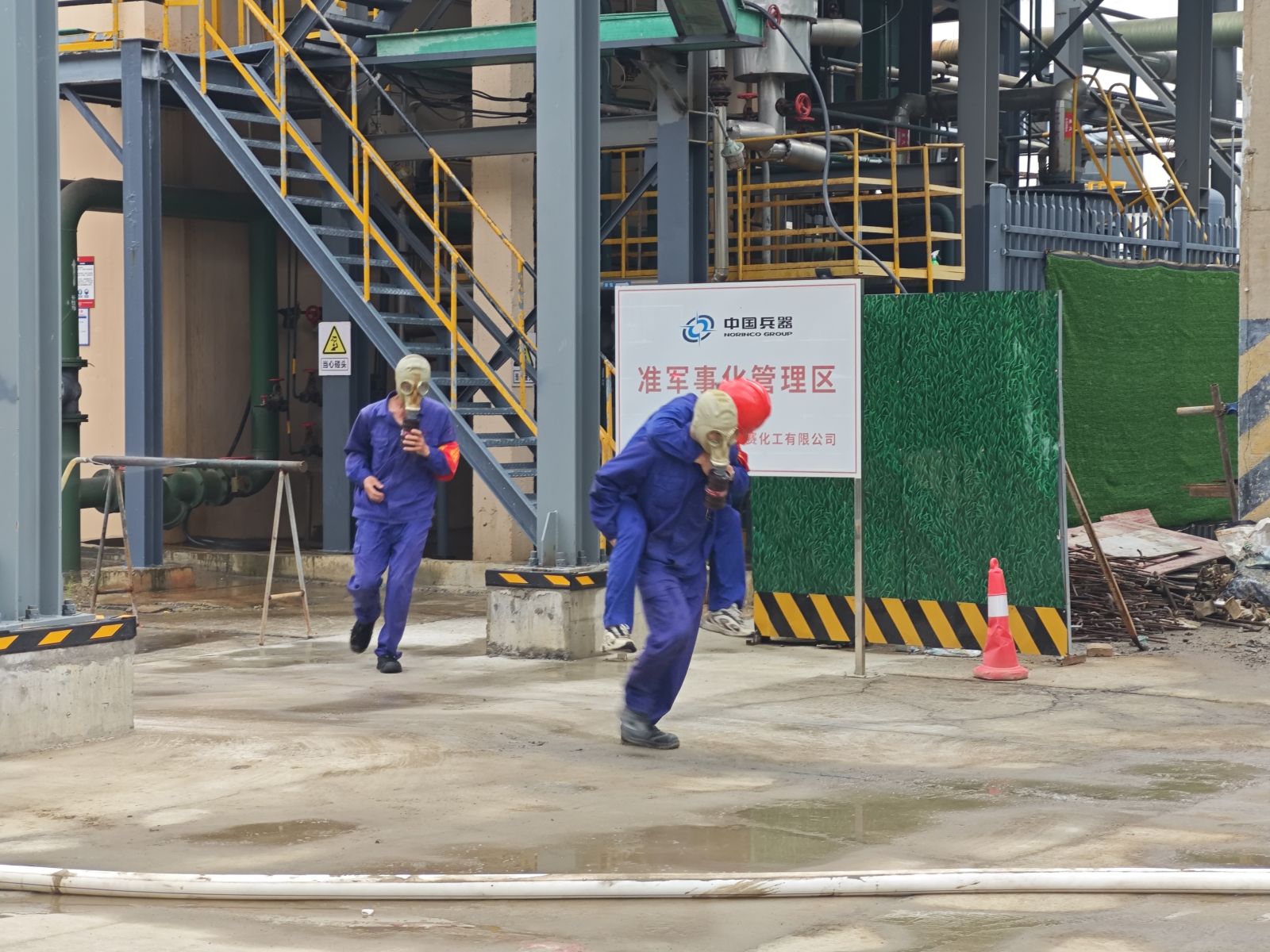 演練模擬氯車間液氯氣化器緩沖罐底部短管穿孔導(dǎo)致氯氣泄漏的突發(fā)狀況。隨著警報響起,各應(yīng)急小組迅速響應(yīng):疏散引導(dǎo)組立即組織周邊人員有序撤離;搶險堵漏組規(guī)范穿戴重型防化服和正壓式空氣呼吸器,攜帶專業(yè)堵漏工具趕赴泄漏點實施封堵;環(huán)境監(jiān)測組實時監(jiān)測周邊氯氣濃度變化。經(jīng)過多部門協(xié)同作戰(zhàn),泄漏點被成功封堵,險情得到有效控制。